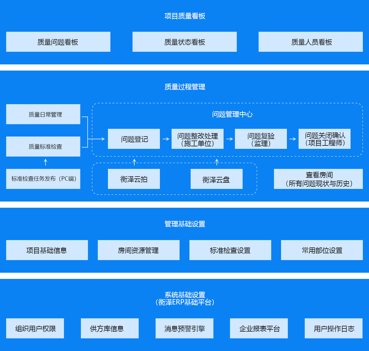 《衡澤ERP-工程管理系列》產(chǎn)品線通過(guò)領(lǐng)先的移動(dòng)互聯(lián)網(wǎng)技術(shù),讓地產(chǎn)工程建造環(huán)節(jié)的各類業(yè)務(wù)場(chǎng)景在線化,支持土建、初裝、精裝修等項(xiàng)目各階段的移動(dòng)計(jì)劃管理、移動(dòng)質(zhì)量檢查。